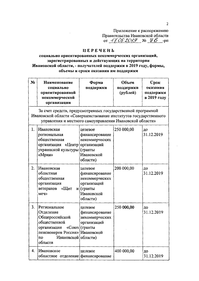 Распоряжение Правительства Ивановской области от 17.05.2019 N 76-рп "О формах, объемах и сроках оказания поддержки социально ориентированным некоммерческим организациям, зарегистрированным и действующим на территории Ивановской области, в 2019 году" (вместе с "Перечнем социально ориентированных некоммерческих организаций, зарегистрированных и действующих на территории Ивановской области, - получателей поддержки в 2019 году, формами, объемами и сроками оказания им поддержки")