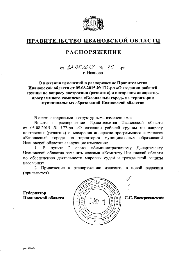 Распоряжение Правительства Ивановской области от 23.05.2019 N 80-рп "О внесении изменений в распоряжение Правительства Ивановской области от 05.08.2015 N 177-рп "О создании рабочей группы по вопросу построения (развития) и внедрения аппаратно-программного комплекса "Безопасный город" на территории муниципальных образований Ивановской области"