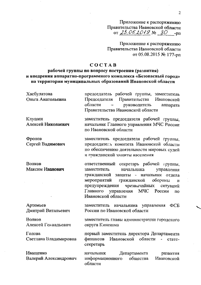 Распоряжение Правительства Ивановской области от 23.05.2019 N 80-рп "О внесении изменений в распоряжение Правительства Ивановской области от 05.08.2015 N 177-рп "О создании рабочей группы по вопросу построения (развития) и внедрения аппаратно-программного комплекса "Безопасный город" на территории муниципальных образований Ивановской области"