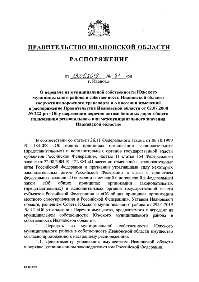 Распоряжение Правительства Ивановской области от 23.05.2019 N 81-рп "О передаче из муниципальной собственности Южского муниципального района в собственность Ивановской области сооружения дорожного транспорта и о внесении изменений в распоряжение Правительства Ивановской области от 02.07.2008 N 222-рп "Об утверждении перечня автомобильных дорог общего пользования регионального или межмуниципального значения Ивановской области" (вместе с "Перечнем имущества, передаваемого из муниципальной собственности Южского муниципального района в собственность Ивановской области")