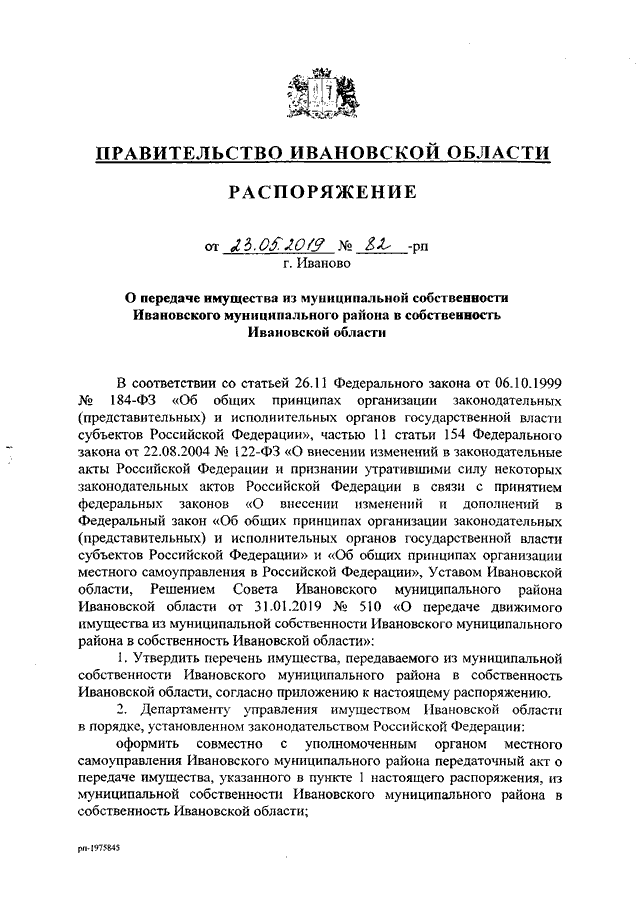 Распоряжение Правительства Ивановской области от 23.05.2019 N 82-рп "О передаче имущества из муниципальной собственности Ивановского муниципального района в собственность Ивановской области"