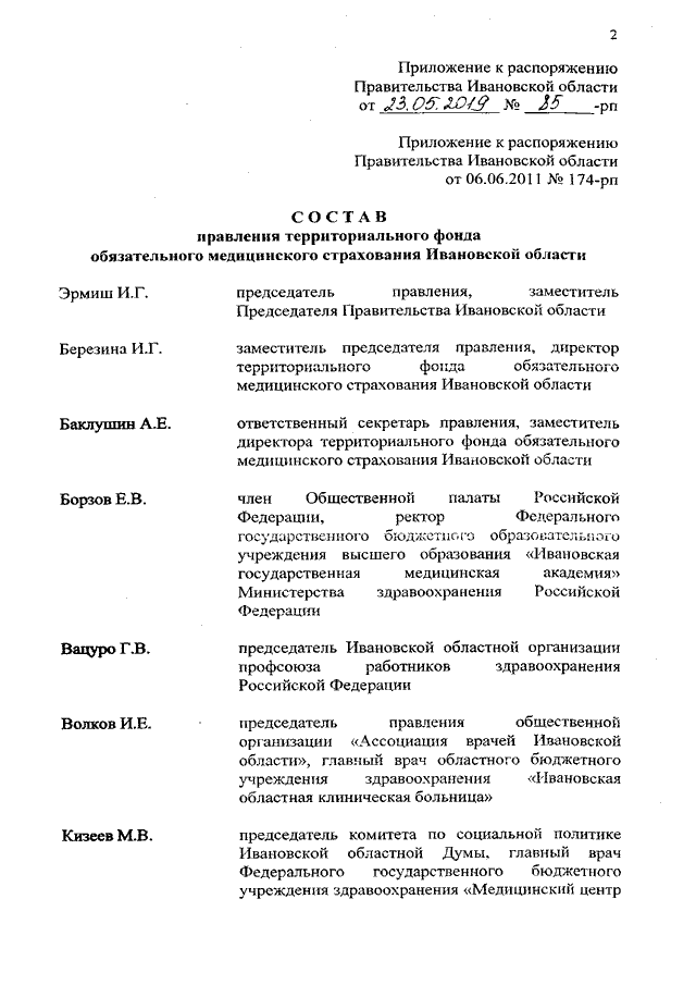 Распоряжение Правительства Ивановской области от 23.05.2019 N 85-рп "О внесении изменения в распоряжение Правительства Ивановской области от 06.06.2011 N 174-рп "Об утверждении состава правления территориального фонда обязательного медицинского страхования Ивановской области"