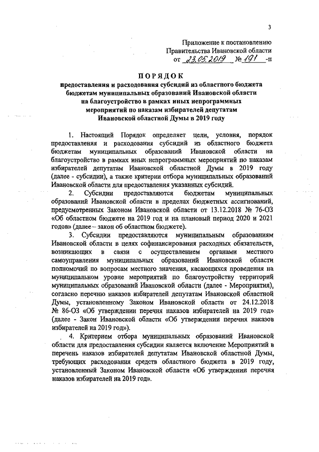 Постановление Правительства Ивановской области от 23.05.2019 N 191-п "Об утверждении Порядка предоставления и расходования субсидий из областного бюджета бюджетам муниципальных образований Ивановской области на благоустройство в рамках иных непрограммных мероприятий по наказам избирателей депутатам Ивановской областной Думы в 2019 году"