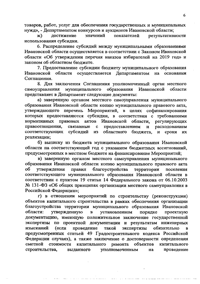 Постановление Правительства Ивановской области от 23.05.2019 N 191-п "Об утверждении Порядка предоставления и расходования субсидий из областного бюджета бюджетам муниципальных образований Ивановской области на благоустройство в рамках иных непрограммных мероприятий по наказам избирателей депутатам Ивановской областной Думы в 2019 году"