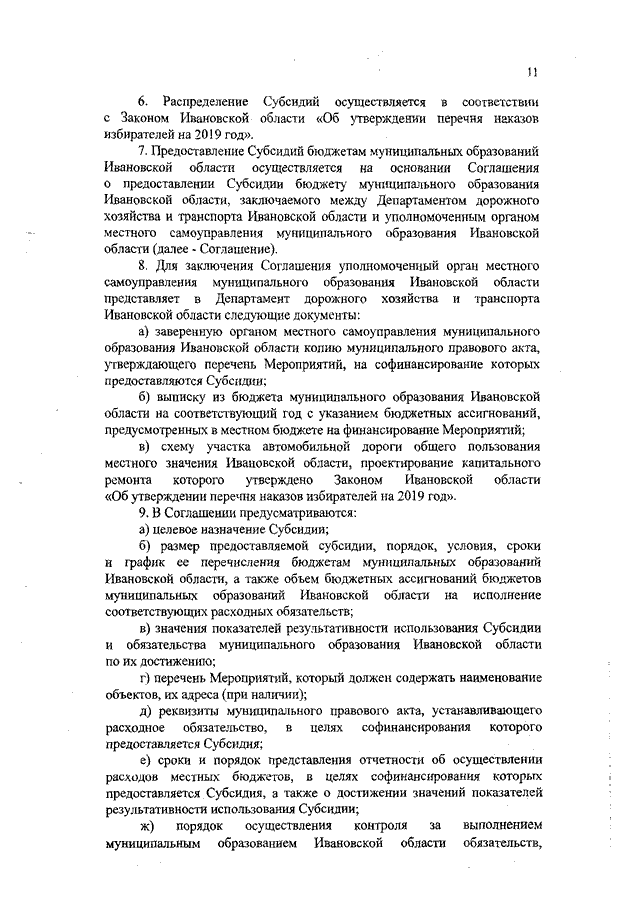 Постановление Правительства Ивановской области от 23.05.2019 N 190-п "Об утверждении Порядка предоставления и расходования субсидий из областного бюджета бюджетам муниципальных образований Ивановской области на ремонт автомобильных дорог и искусственных сооружений на них в рамках иных непрограммных мероприятий по наказам избирателей депутатам Ивановской областной Думы и Порядка предоставления и расходования субсидий из областного бюджета бюджетам муниципальных образований Ивановской области на разработку проектно-сметной документации на капитальный ремонт автомобильных дорог в рамках иных непрограммных мероприятий по наказам избирателей депутатам Ивановской областной Думы на 2019 год"