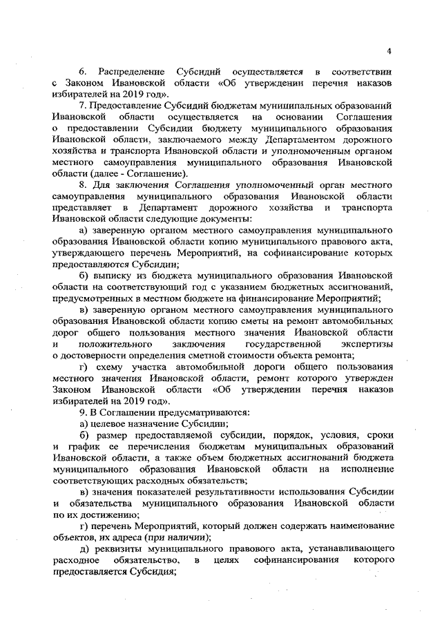 Постановление Правительства Ивановской области от 23.05.2019 N 190-п "Об утверждении Порядка предоставления и расходования субсидий из областного бюджета бюджетам муниципальных образований Ивановской области на ремонт автомобильных дорог и искусственных сооружений на них в рамках иных непрограммных мероприятий по наказам избирателей депутатам Ивановской областной Думы и Порядка предоставления и расходования субсидий из областного бюджета бюджетам муниципальных образований Ивановской области на разработку проектно-сметной документации на капитальный ремонт автомобильных дорог в рамках иных непрограммных мероприятий по наказам избирателей депутатам Ивановской областной Думы на 2019 год"