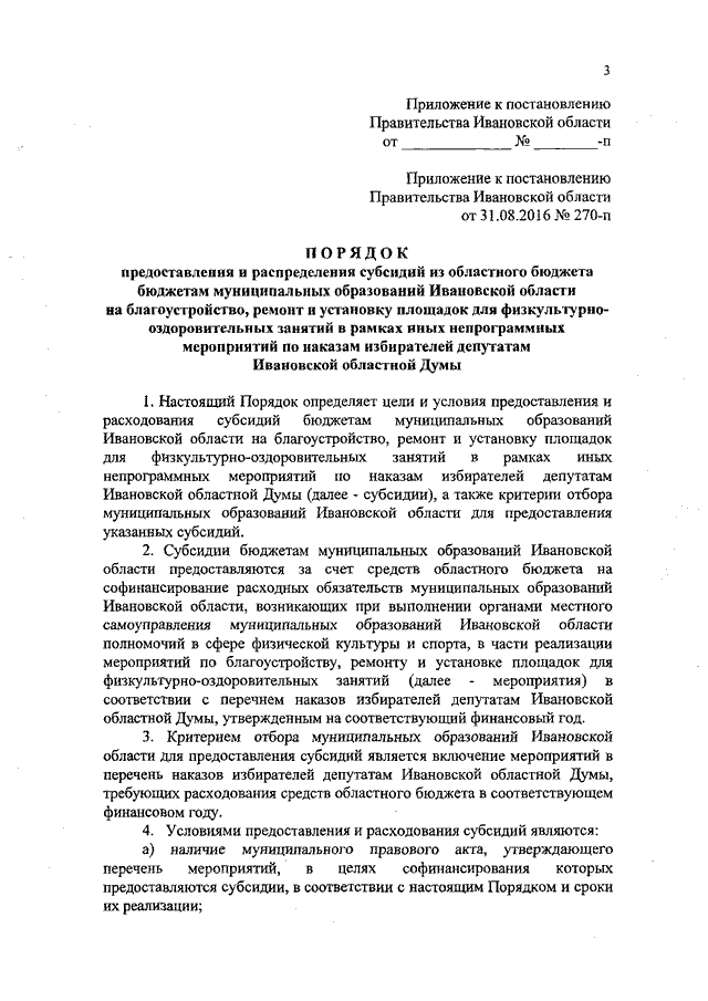 Постановление Правительства Ивановской области от 23.05.2019 N 189-п "О внесении изменений в постановление Правительства Ивановской области от 31.08.2016 N 270-п "Об утверждении Порядка предоставления и распределения из областного бюджета субсидий бюджетам муниципальных образований Ивановской области на благоустройство, ремонт и установку площадок для физкультурно-оздоровительных занятий" (вместе с "Порядком предоставления и распределения субсидий из областного бюджета бюджетам муниципальных образований Ивановской области на благоустройство, ремонт и установку площадок для физкультурно-оздоровительных занятий в рамках иных непрограммных мероприятий по наказам избирателей депутатам Ивановской областной Думы")