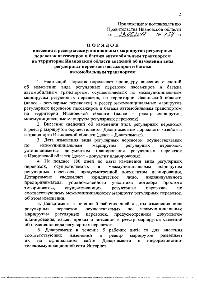 Постановление Правительства Ивановской области от 23.05.2019 N 187-п "Об утверждении Порядка внесения в реестр межмуниципальных маршрутов регулярных перевозок пассажиров и багажа автомобильным транспортом на территории Ивановской области сведений об изменении вида регулярных перевозок пассажиров и багажа автомобильным транспортом"