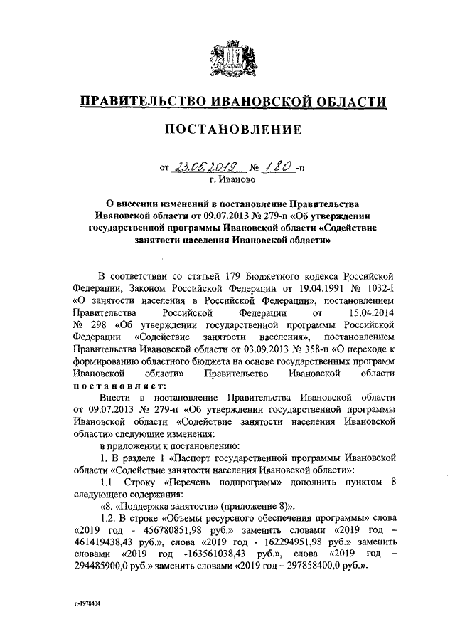 Постановление Правительства Ивановской области от 23.05.2019 N 180-п "О внесении изменений в постановление Правительства Ивановской области от 09.07.2013 N 279-п "Об утверждении государственной программы Ивановской области "Содействие занятости населения Ивановской области" (вместе с "Подпрограммой "Поддержка занятости")