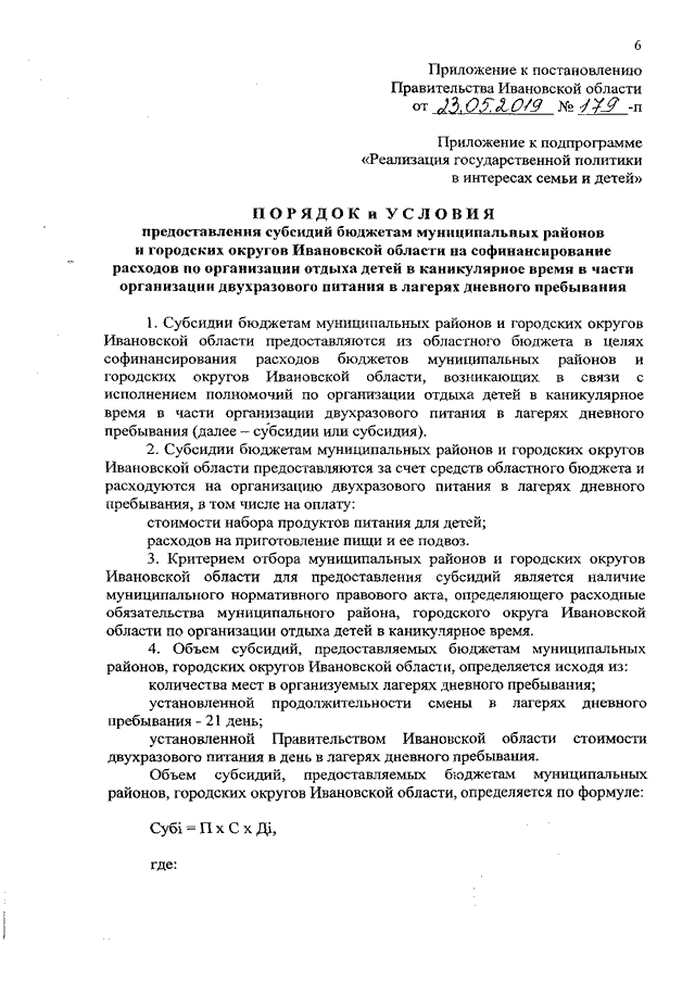 Постановление Правительства Ивановской области от 23.05.2019 N 179-п "О внесении изменений в постановление Правительства Ивановской области от 15.10.2013 N 393-п "Об утверждении государственной программы Ивановской области "Социальная поддержка граждан в Ивановской области" (вместе с "Порядком и условиями предоставления субсидий бюджетам муниципальных районов и городских округов Ивановской области на софинансирование расходов по организации отдыха детей в каникулярное время в части организации двухразового питания в лагерях дневного пребывания")