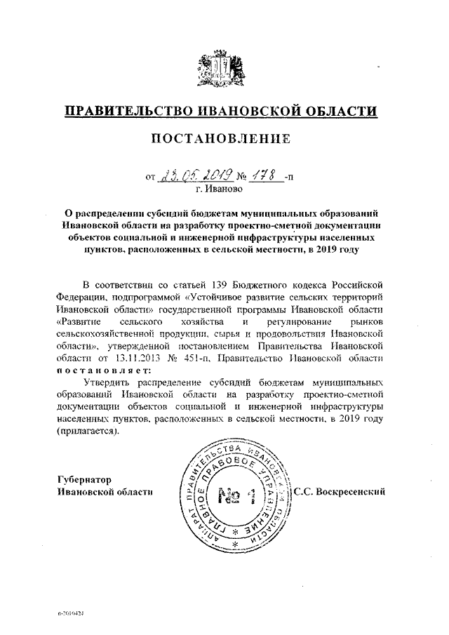 Постановление Правительства Ивановской области от 23.05.2019 N 178-п "О распределении субсидий бюджетам муниципальных образований Ивановской области на разработку проектно-сметной документации объектов социальной и инженерной инфраструктуры населенных пунктов, расположенных в сельской местности, в 2019 году"