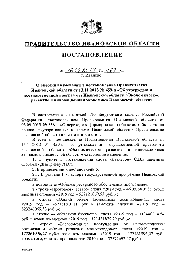 Постановление Правительства Ивановской области от 17.05.2019 N 177-п "О внесении изменений в постановление Правительства Ивановской области от 13.11.2013 N 459-п "Об утверждении государственной программы Ивановской области "Экономическое развитие и инновационная экономика Ивановской области"