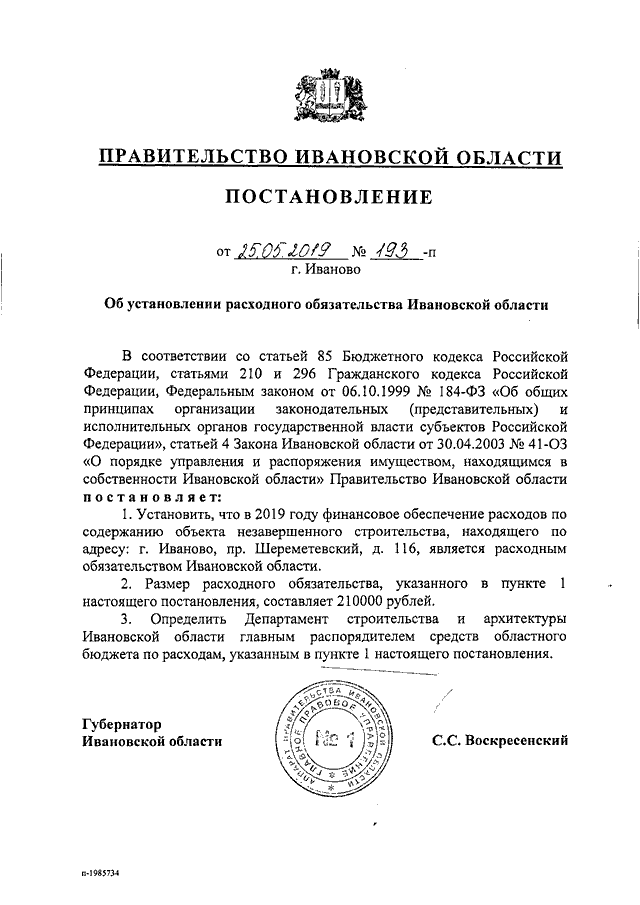 Постановление Правительства Ивановской области от 25.05.2019 N 193-п "Об установлении расходного обязательства Ивановской области"