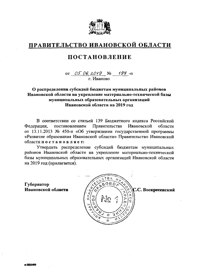 Постановление Правительства Ивановской области от 05.06.2019 N 197-п "О распределении субсидий бюджетам муниципальных районов Ивановской области на укрепление материально-технической базы муниципальных образовательных организаций Ивановской области на 2019 год"
