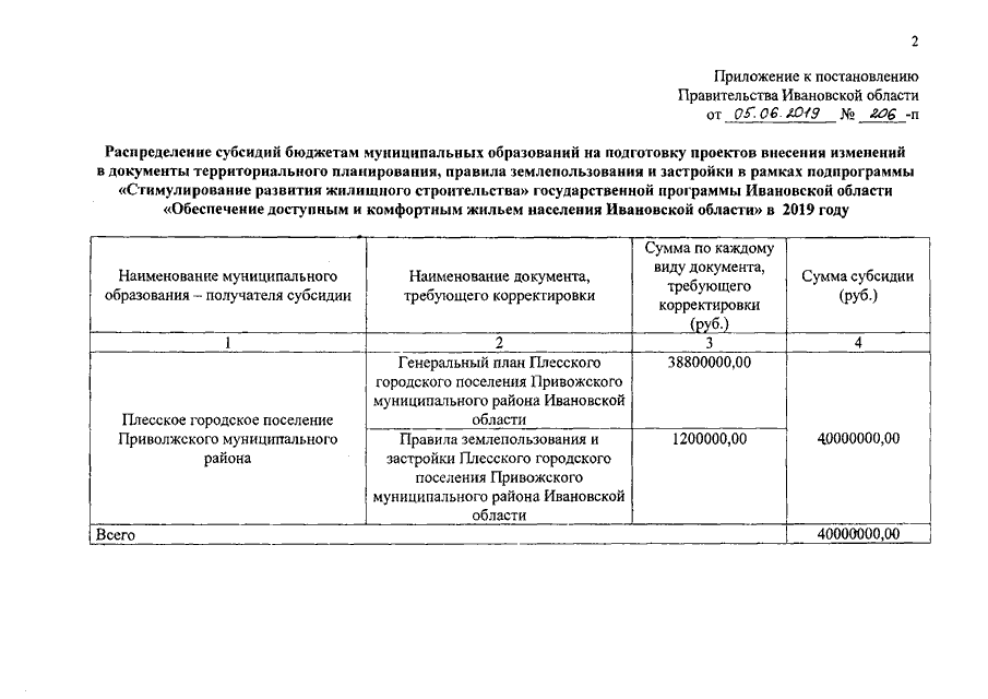 Постановление Правительства Ивановской области от 05.06.2019 N 206-п "О распределении субсидий бюджетам муниципальных образований на подготовку проектов внесения изменений в документы территориального планирования, правила землепользования и застройки в рамках подпрограммы "Стимулирование развития жилищного строительства" государственной программы Ивановской области "Обеспечение доступным и комфортным жильем населения Ивановской области" в 2019 году"