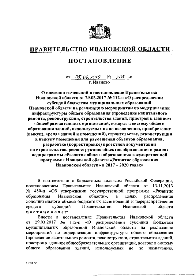 Постановление Правительства Ивановской области от 05.06.2019 N 205-п "О внесении изменений в постановление Правительства Ивановской области от 29.03.2017 N 112-п "О распределении субсидий бюджетам муниципальных образований Ивановской области на реализацию мероприятий по модернизации инфраструктуры общего образования (проведение капитального ремонта, реконструкции, строительства зданий, пристроя к зданиям общеобразовательных организаций, возврат в систему общего образования зданий, используемых не по назначению, приобретение (выкуп), аренда зданий и помещений), строительству, реконструкции и выкупу помещений для размещения объектов образования, разработке (корректировке) проектной документации на строительство, реконструкцию объектов образования в рамках подпрограммы "Развитие общего образования" государственной программы Ивановской области "Развитие образования Ивановской области" в 2017 - 2020 годах"