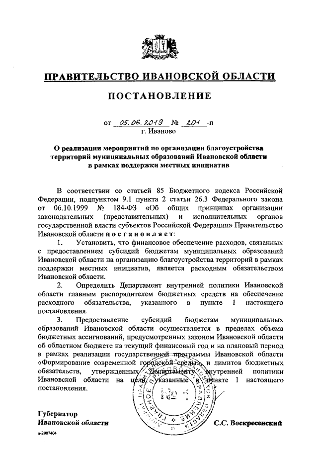 Постановление Правительства Ивановской области от 05.06.2019 N 201-п "О реализации мероприятий по организации благоустройства территорий муниципальных образований Ивановской области в рамках поддержки местных инициатив"