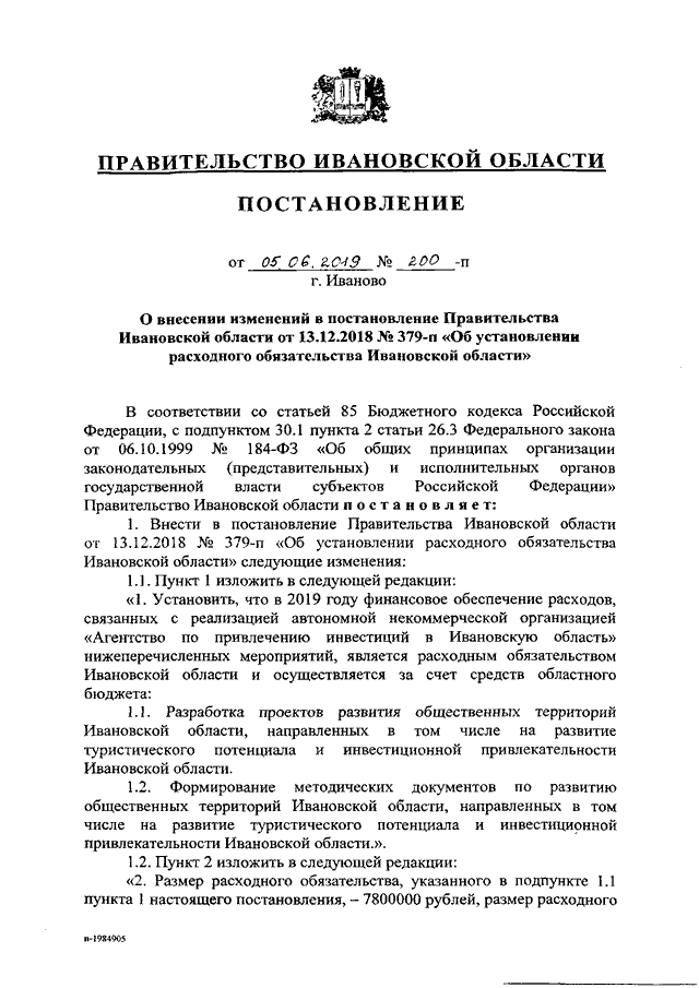 Постановление Правительства Ивановской области от 05.06.2019 N 200-п "О внесении изменений в постановление Правительства Ивановской области от 13.12.2018 N 379-п "Об установлении расходного обязательства Ивановской области"
