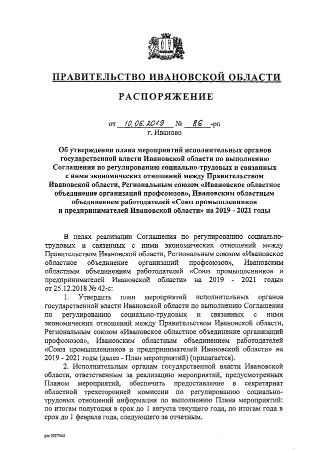 Распоряжение Правительства Ивановской области от 10.06.2019 N 86-рп "Об утверждении плана мероприятий исполнительных органов государственной власти Ивановской области по выполнению Соглашения по регулированию социально-трудовых и связанных с ними экономических отношений между Правительством Ивановской области, Региональным союзом "Ивановское областное объединение организаций профсоюзов", Ивановским областным объединением работодателей "Союз промышленников и предпринимателей Ивановской области" на 2019 - 2021 годы"