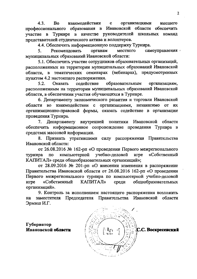 Распоряжение Правительства Ивановской области от 10.06.2019 N 87-рп "О проведении ежегодного ивановского межрегионального турнира по компьютерной учебно-деловой игре "Собственный КАПИТАЛ" среди молодежи" (вместе с "Положением об организационном комитете по обеспечению подготовки и проведения ежегодного ивановского межрегионального турнира по компьютерной учебно-деловой игре "Собственный КАПИТАЛ" среди молодежи")