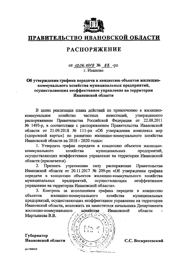 Распоряжение Правительства Ивановской области от 10.06.2019 N 88-рп "Об утверждении графика передачи в концессию объектов жилищно-коммунального хозяйства муниципальных предприятий, осуществляющих неэффективное управление на территории Ивановской области"