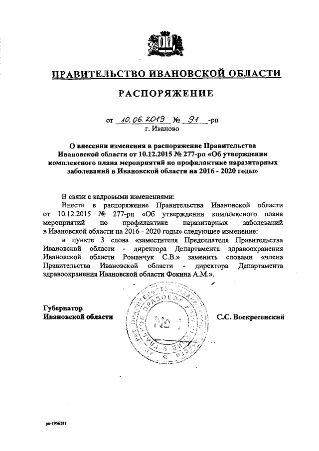 Распоряжение Правительства Ивановской области от 10.06.2019 N 91-рп "О внесении изменения в распоряжение Правительства Ивановской области от 10.12.2015 N 277-рп "Об утверждении комплексного плана мероприятий по профилактике паразитарных заболеваний в Ивановской области на 2016 - 2020 годы"