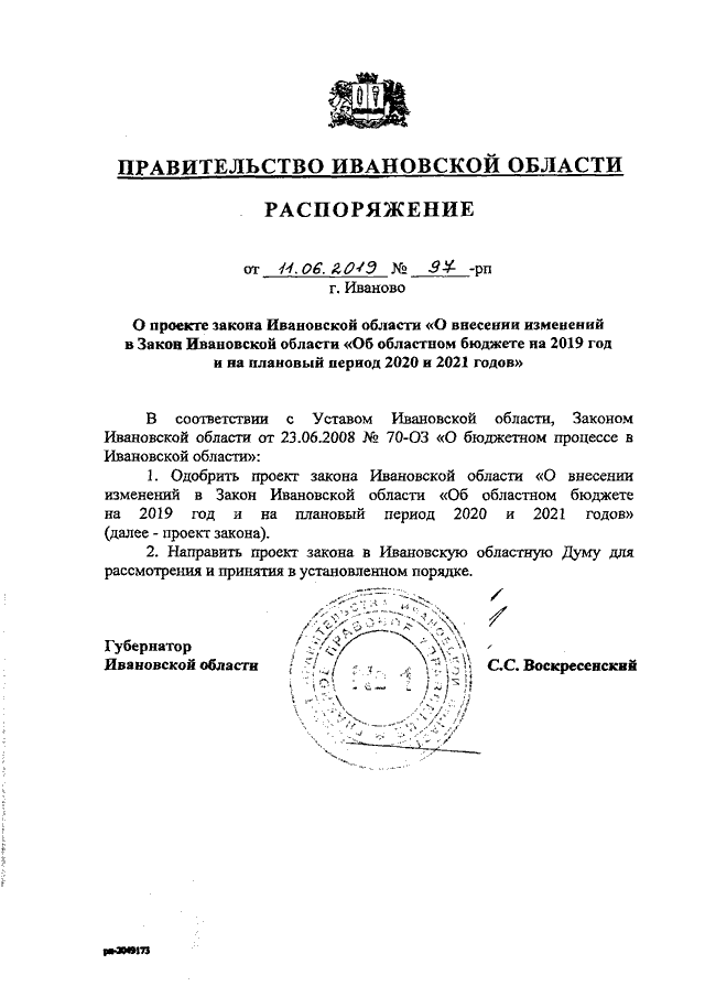 Распоряжение Правительства Ивановской области от 11.06.2019 N 97-рп "О проекте закона Ивановской области "О внесении изменений в Закон Ивановской области "Об областном бюджете на 2019 год и на плановый период 2020 и 2021 годов"