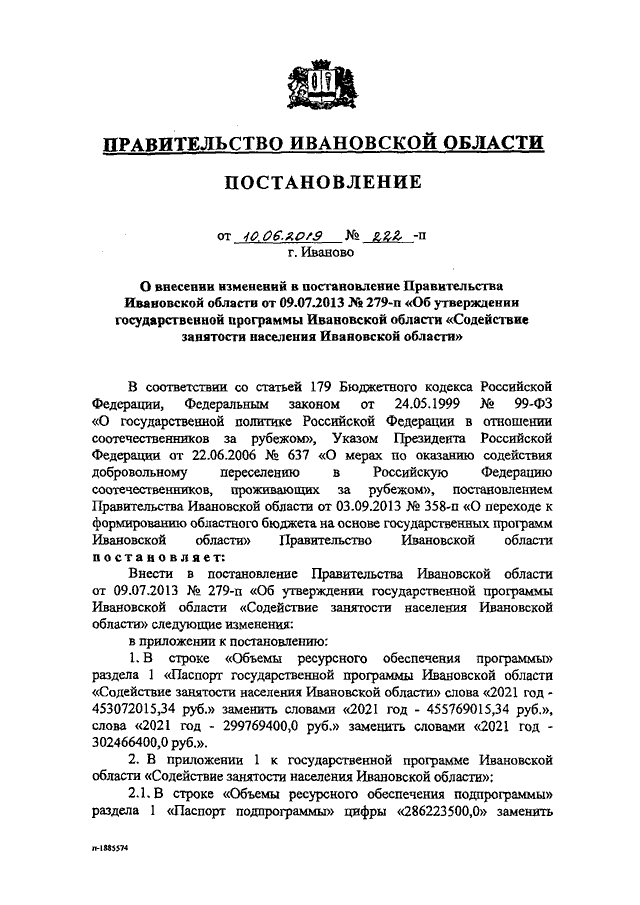 Постановление Правительства Ивановской области от 10.06.2019 N 222-п "О внесении изменений в постановление Правительства Ивановской области от 09.07.2013 N 279-п "Об утверждении государственной программы Ивановской области "Содействие занятости населения Ивановской области"