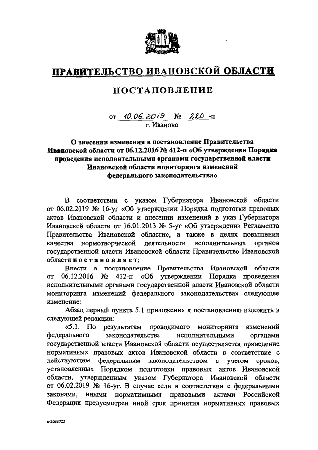 Постановление Правительства Ивановской области от 10.06.2019 N 220-п "О внесении изменения в постановление Правительства Ивановской области от 06.12.2016 N 412-п "Об утверждении Порядка проведения исполнительными органами государственной власти Ивановской области мониторинга изменений федерального законодательства"