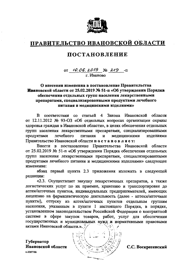 Постановление Правительства Ивановской области от 10.06.2019 N 219-п "О внесении изменения в постановление Правительства Ивановской области от 25.02.2019 N 51-п "Об утверждении Порядка обеспечения отдельных групп населения лекарственными препаратами, специализированными продуктами лечебного питания и медицинскими изделиями"