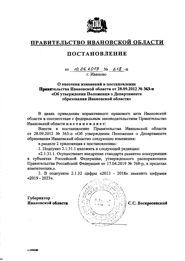 Постановление Правительства Ивановской области от 10.06.2019 N 218-п "О внесении изменений в постановление Правительства Ивановской области от 28.09.2012 N 363-п "Об утверждении Положения о Департаменте образования Ивановской области"