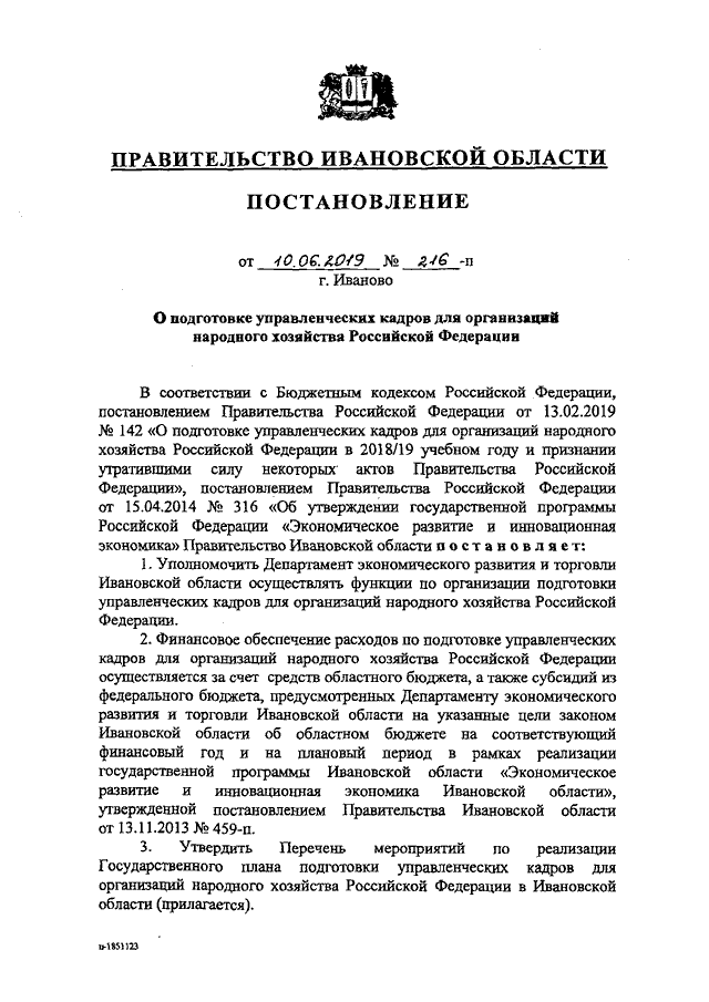 Постановление Правительства Ивановской области от 10.06.2019 N 216-п "О подготовке управленческих кадров для организаций народного хозяйства Российской Федерации" (вместе с "Перечнем мероприятий по реализации Государственного плана подготовки управленческих кадров для организаций народного хозяйства Российской Федерации в Ивановской области")