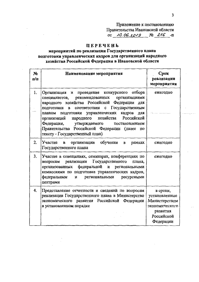 Постановление Правительства Ивановской области от 10.06.2019 N 216-п "О подготовке управленческих кадров для организаций народного хозяйства Российской Федерации" (вместе с "Перечнем мероприятий по реализации Государственного плана подготовки управленческих кадров для организаций народного хозяйства Российской Федерации в Ивановской области")