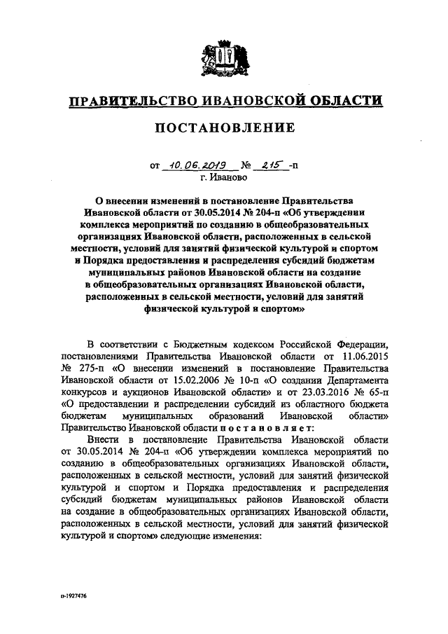 Постановление Правительства Ивановской области от 10.06.2019 N 215-п "О внесении изменений в постановление Правительства Ивановской области от 30.05.2014 N 204-п "Об утверждении комплекса мероприятий по созданию в общеобразовательных организациях Ивановской области, расположенных в сельской местности, условий для занятий физической культурой и спортом и Порядка предоставления и распределения субсидий бюджетам муниципальных районов Ивановской области на создание в общеобразовательных организациях Ивановской области, расположенных в сельской местности, условий для занятий физической культурой и спортом"