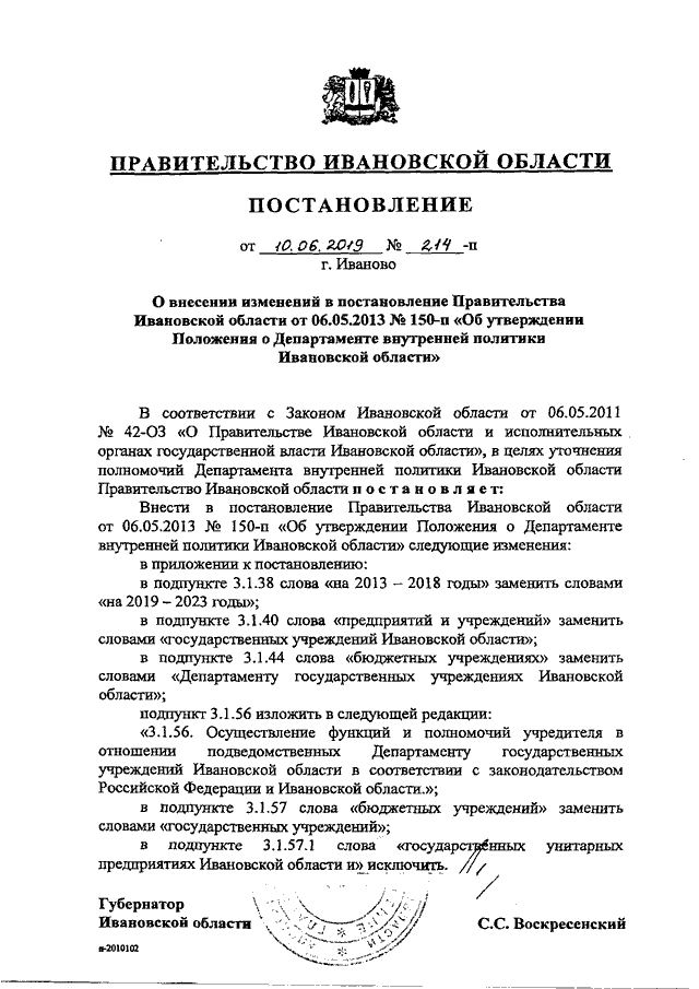 Постановление Правительства Ивановской области от 10.06.2019 N 214-п "О внесении изменений в постановление Правительства Ивановской области от 06.05.2013 N 150-п "Об утверждении Положения о Департаменте внутренней политики Ивановской области"
