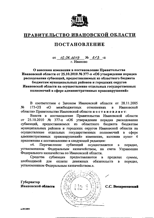 Постановление Правительства Ивановской области от 10.06.2019 N 213-п "О внесении изменения в постановление Правительства Ивановской области от 25.10.2010 N 377-п "Об утверждении порядка расходования субвенций, предоставляемых из областного бюджета бюджетам муниципальных районов и городских округов Ивановской области на осуществление отдельных государственных полномочий в сфере административных правонарушений"