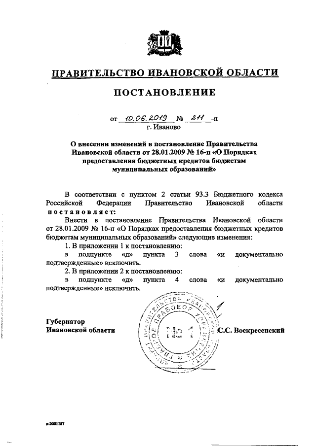 Постановление Правительства Ивановской области от 10.06.2019 N 211-п "О внесении изменений в постановление Правительства Ивановской области от 28.01.2009 N 16-п "О Порядках предоставления бюджетных кредитов бюджетам муниципальных образований"