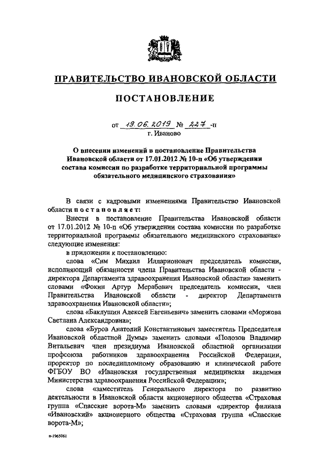 Постановление Правительства Ивановской области от 19.06.2019 N 227-п "О внесении изменений в постановление Правительства Ивановской области от 17.01.2012 N 10-п "Об утверждении состава комиссии по разработке территориальной программы обязательного медицинского страхования"