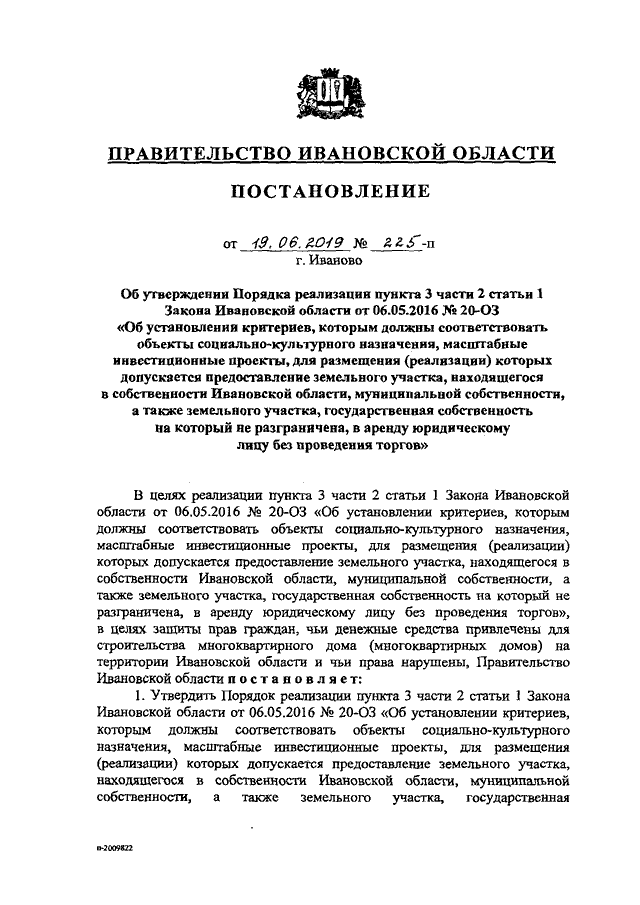 Постановление Правительства Ивановской области от 19.06.2019 N 225-п "Об утверждении Порядка реализации пункта 3 части 2 статьи 1 Закона Ивановской области от 06.05.2016 N 20-ОЗ "Об установлении критериев, которым должны соответствовать объекты социально-культурного назначения, масштабные инвестиционные проекты, для размещения (реализации) которых допускается предоставление земельного участка, находящегося в собственности Ивановской области, муниципальной собственности, а также земельного участка, государственная собственность на который не разграничена, в аренду юридическому лицу без проведения торгов"