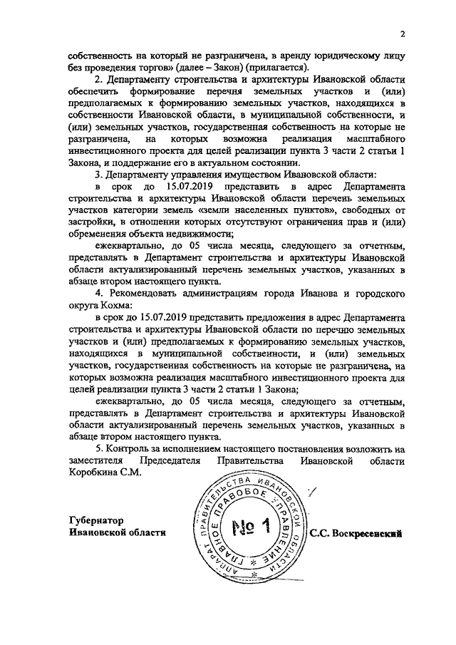 Постановление Правительства Ивановской области от 19.06.2019 N 225-п "Об утверждении Порядка реализации пункта 3 части 2 статьи 1 Закона Ивановской области от 06.05.2016 N 20-ОЗ "Об установлении критериев, которым должны соответствовать объекты социально-культурного назначения, масштабные инвестиционные проекты, для размещения (реализации) которых допускается предоставление земельного участка, находящегося в собственности Ивановской области, муниципальной собственности, а также земельного участка, государственная собственность на который не разграничена, в аренду юридическому лицу без проведения торгов"