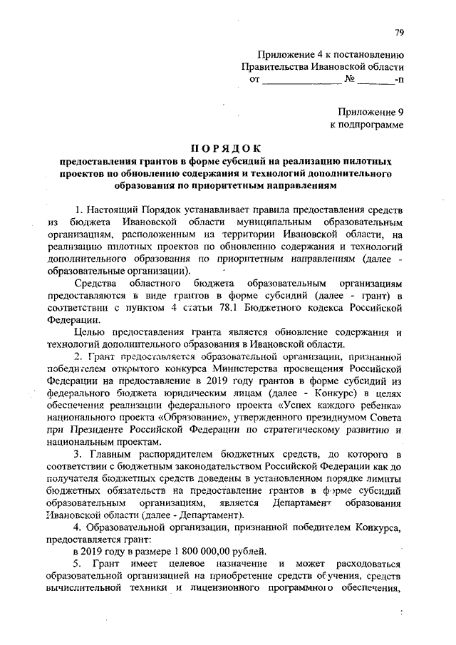 Постановление Правительства Ивановской области от 24.06.2019 N 229-п "О внесении изменений в постановление Правительства Ивановской области от 13.11.2013 N 450-п "Об утверждении государственной программы "Развитие образования Ивановской области" (вместе с "Порядком предоставления грантов в форме субсидий на реализацию пилотных проектов по обновлению содержания и технологий дополнительного образования по приоритетным направлениям")