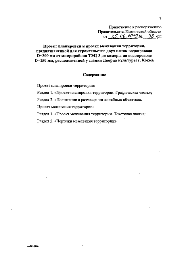 Распоряжение Правительства Ивановской области от 25.06.2019 N 98-рп "Об утверждении проекта планировки и проекта межевания территории, предназначенной для строительства двух ниток водопровода D = 300 мм от микрорайона ТЭЦ-3 до камеры на водопроводе D = 150 мм, расположенной у здания Дворца культуры г. Кохма"