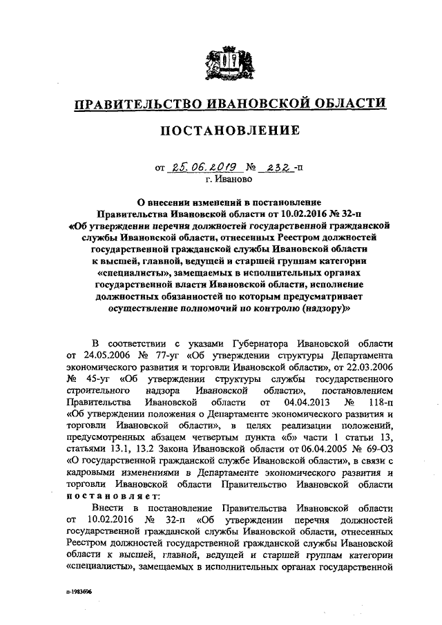 Постановление Правительства Ивановской области от 25.06.2019 N 232-п "О внесении изменений в постановление Правительства Ивановской области от 10.02.2016 N 32-п "Об утверждении перечня должностей государственной гражданской службы Ивановской области, отнесенных Реестром должностей государственной гражданской службы Ивановской области к высшей, главной, ведущей и старшей группам категории "специалисты", замещаемых в исполнительных органах государственной власти Ивановской области, исполнение должностных обязанностей по которым предусматривает осуществление полномочий по контролю (надзору)"
