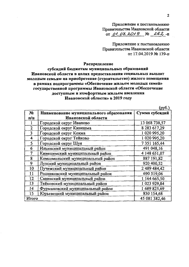 Постановление Правительства Ивановской области от 01.07.2019 N 262-п "О внесении изменения в постановление Правительства Ивановской области от 17.04.2019 N 139-п "О распределении субсидий бюджетам муниципальных образований Ивановской области в целях предоставления социальных выплат молодым семьям на приобретение (строительство) жилого помещения в рамках подпрограммы "Обеспечение жильем молодых семей" государственной программы Ивановской области "Обеспечение доступным и комфортным жильем населения Ивановской области" в 2019 году"