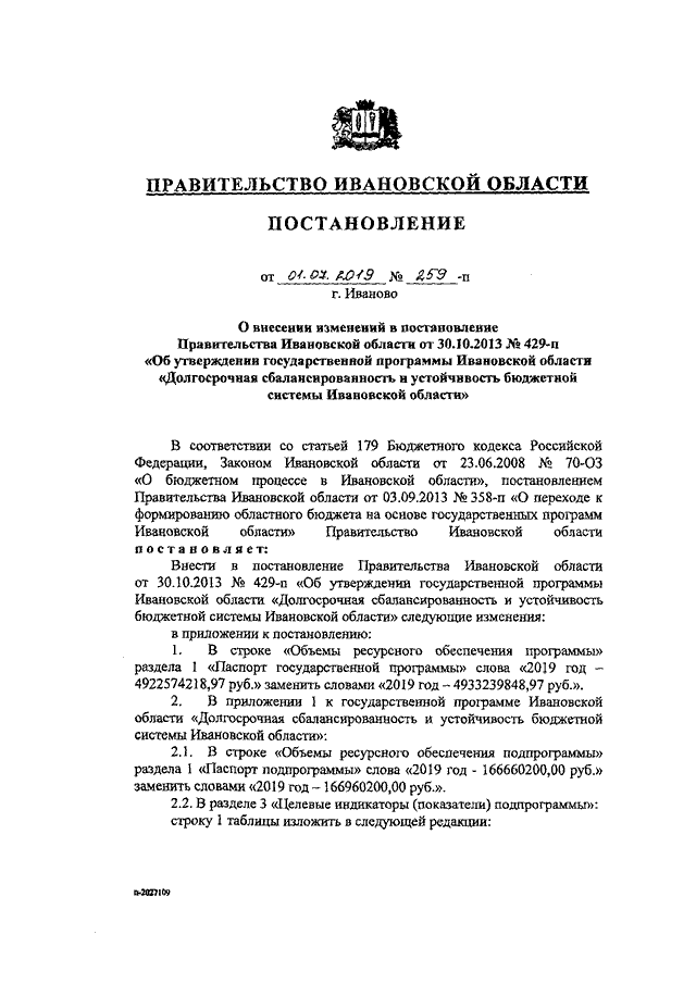 Постановление Правительства Ивановской области от 01.07.2019 N 259-п "О внесении изменений в постановление Правительства Ивановской области от 30.10.2013 N 429-п "Об утверждении государственной программы Ивановской области "Долгосрочная сбалансированность и устойчивость бюджетной системы Ивановской области"