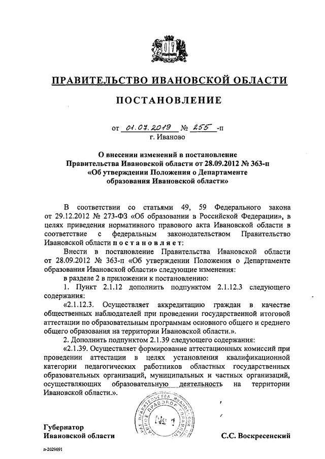 Постановление Правительства Ивановской области от 01.07.2019 N 255-п "О внесении изменений в постановление Правительства Ивановской области от 28.09.2012 N 363-п "Об утверждении Положения о Департаменте образования Ивановской области"