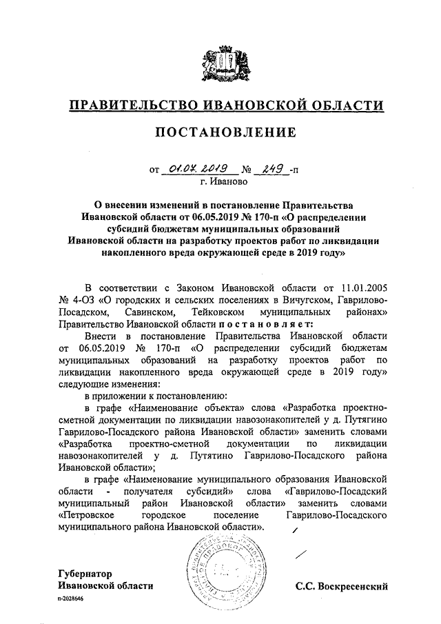 Постановление Правительства Ивановской области от 01.07.2019 N 249-п "О внесении изменений в постановление Правительства Ивановской области от 06.05.2019 N 170-п "О распределении субсидий бюджетам муниципальных образований Ивановской области на разработку проектов работ по ликвидации накопленного вреда окружающей среде в 2019 году"