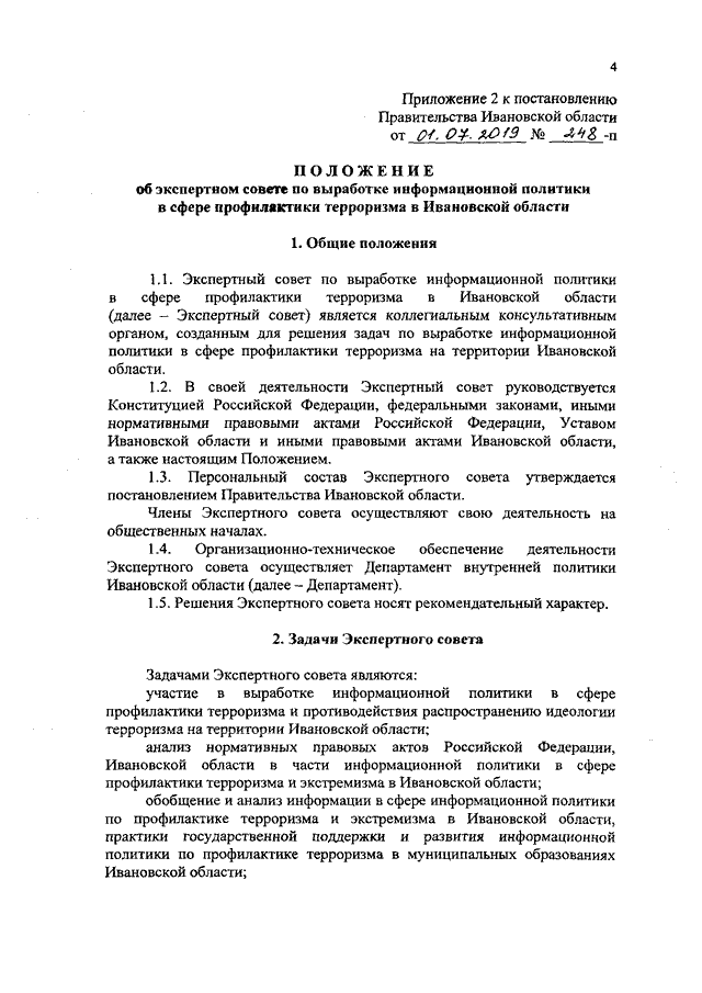 Постановление Правительства Ивановской области от 01.07.2019 N 248-п "О создании экспертного совета по выработке информационной политики в сфере профилактики терроризма в Ивановской области" (вместе с "Положением об экспертном совете по выработке информационной политики в сфере профилактики терроризма в Ивановской области")