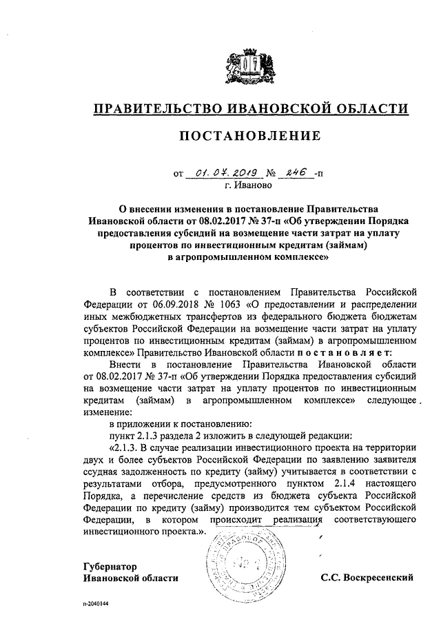 Постановление Правительства Ивановской области от 01.07.2019 N 246-п "О внесении изменения в постановление Правительства Ивановской области от 08.02.2017 N 37-п "Об утверждении Порядка предоставления субсидий на возмещение части затрат на уплату процентов по инвестиционным кредитам (займам) в агропромышленном комплексе"