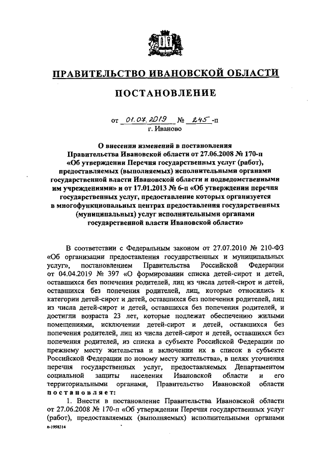 Постановление Правительства Ивановской области от 01.07.2019 N 245-п "О внесении изменений в постановления Правительства Ивановской области от 27.06.2008 N 170-п "Об утверждении Перечня государственных услуг (работ), предоставляемых (выполняемых) исполнительными органами государственной власти Ивановской области и подведомственными им учреждениями" и от 17.01.2013 N 6-п "Об утверждении перечня государственных услуг, предоставление которых организуется в многофункциональных центрах предоставления государственных (муниципальных) услуг исполнительными органами государственной власти Ивановской области"